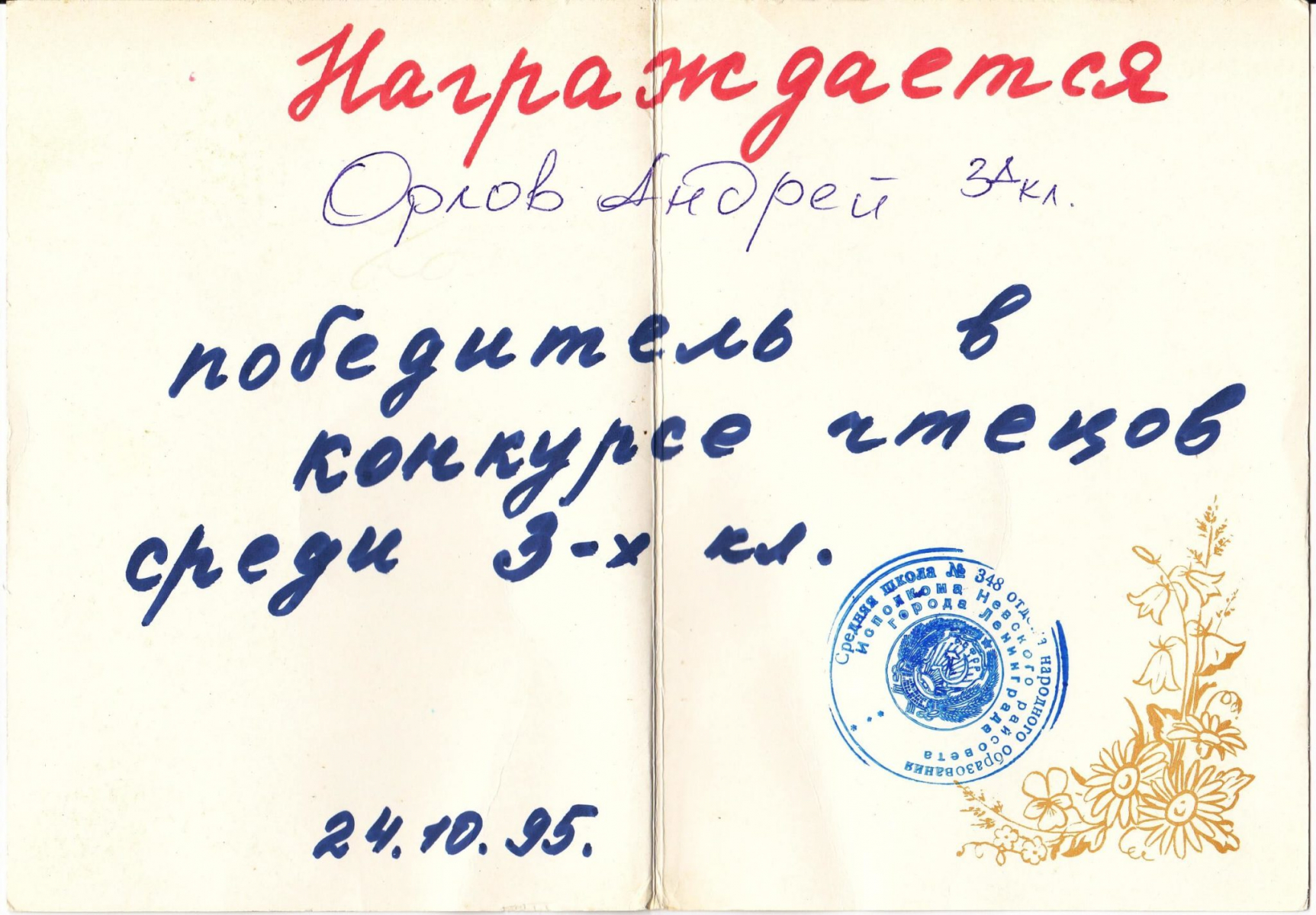- Школу позже переименовали в Государственное образовательное учреждение Школа №348 среднего (полного) общего образования Невского административного района Санкт-Петербурга. 1-й класс я закончил на одни пятёрки. В остальные годы заканчивал годы обучения на 4 и 5, благодаря чему получил множество грамот (я их вешал на стене возле письменного стола, они висели на солнечной стороне и частично выгорели, отсканировал то, что осталось):