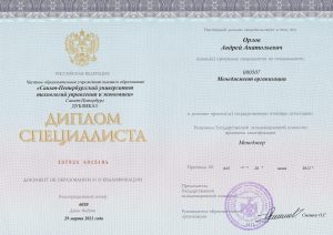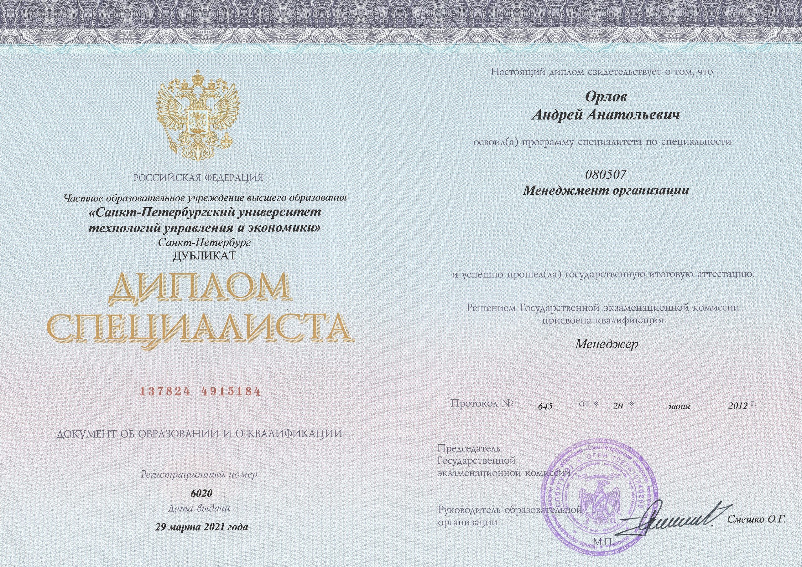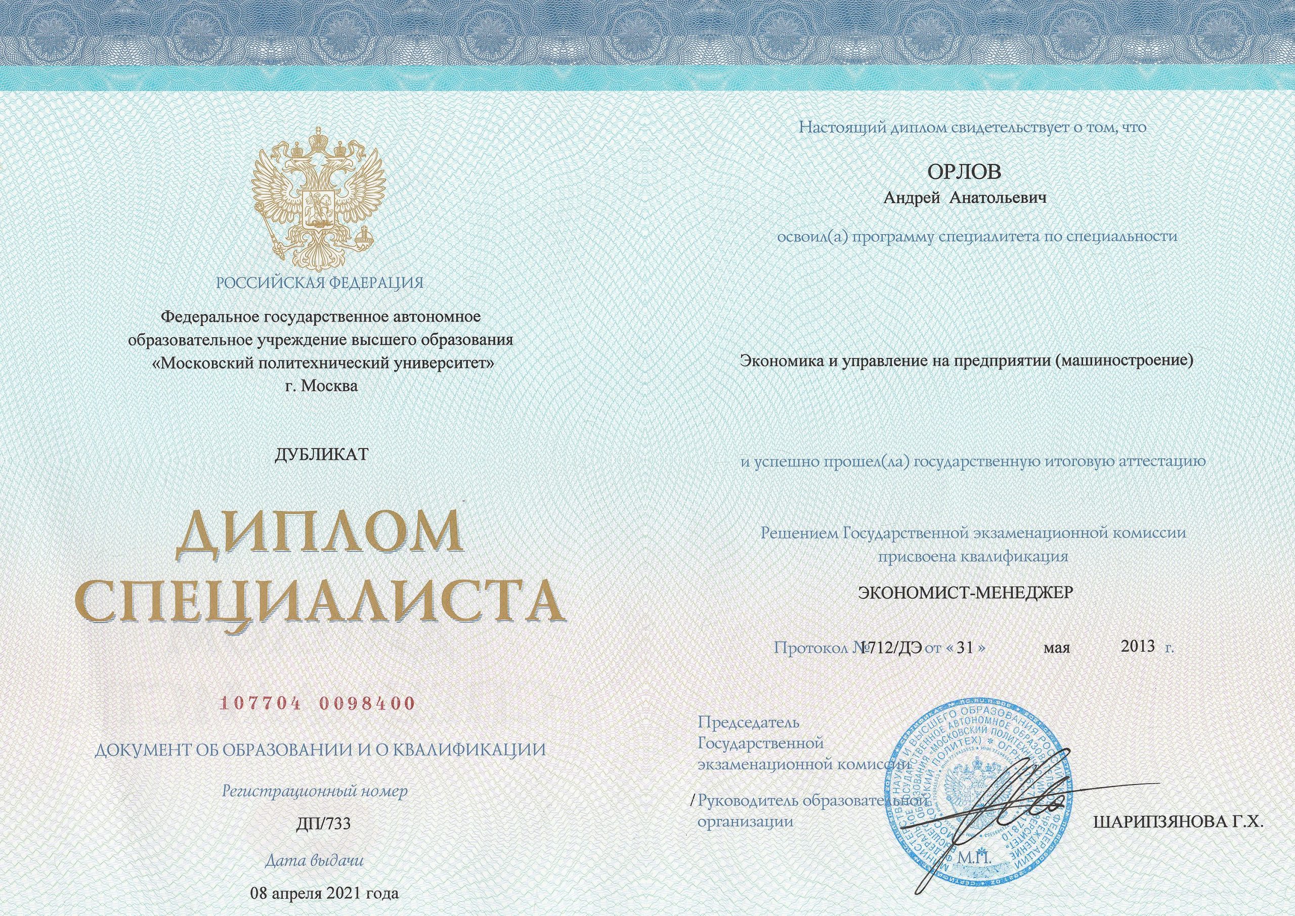 - Дипломированный экономист — второе высшее по специальности: «экономика и управление на предприятии (машиностроение)»