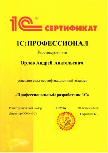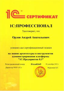 - Сертифицированный 1С: Профессионал (по платформе, и по администрированию), обладатель сертификатов 1С-Битрикс